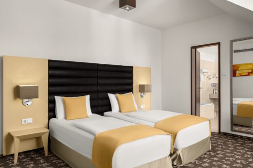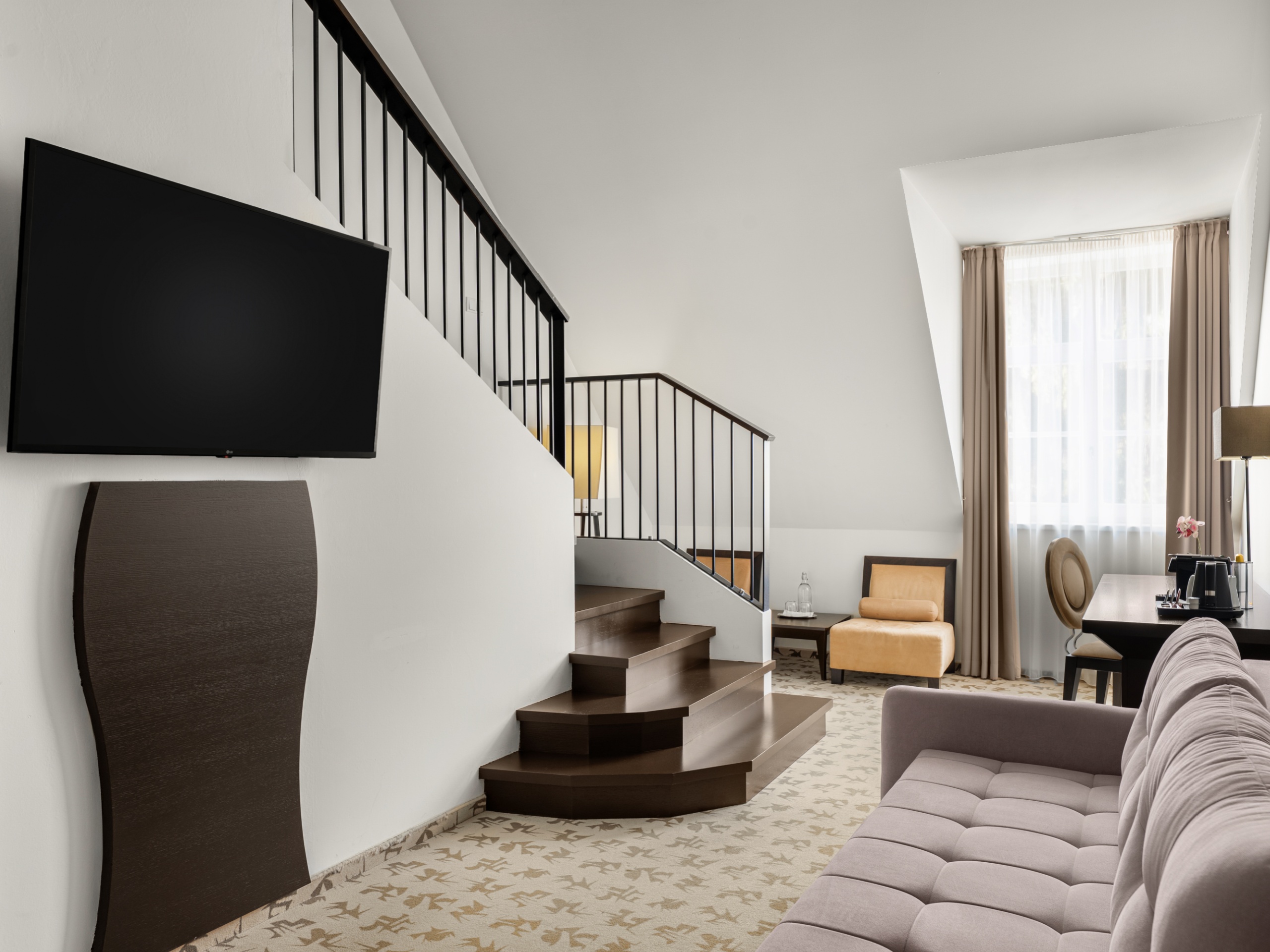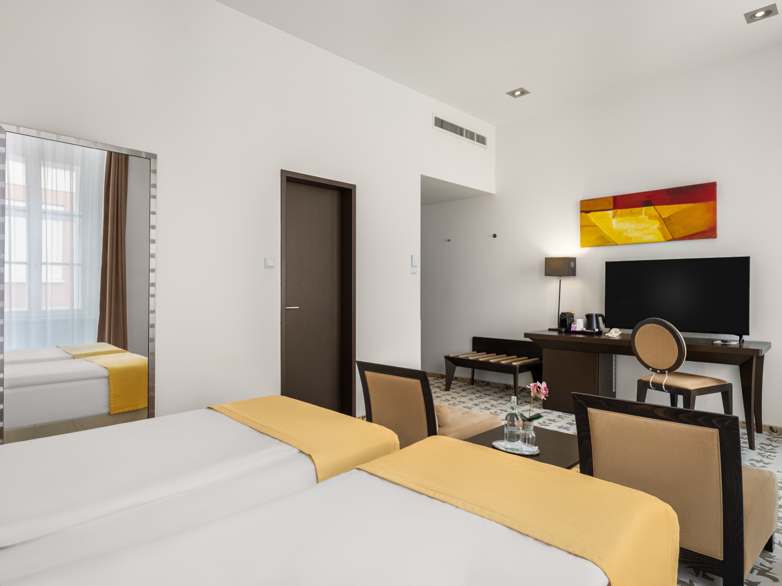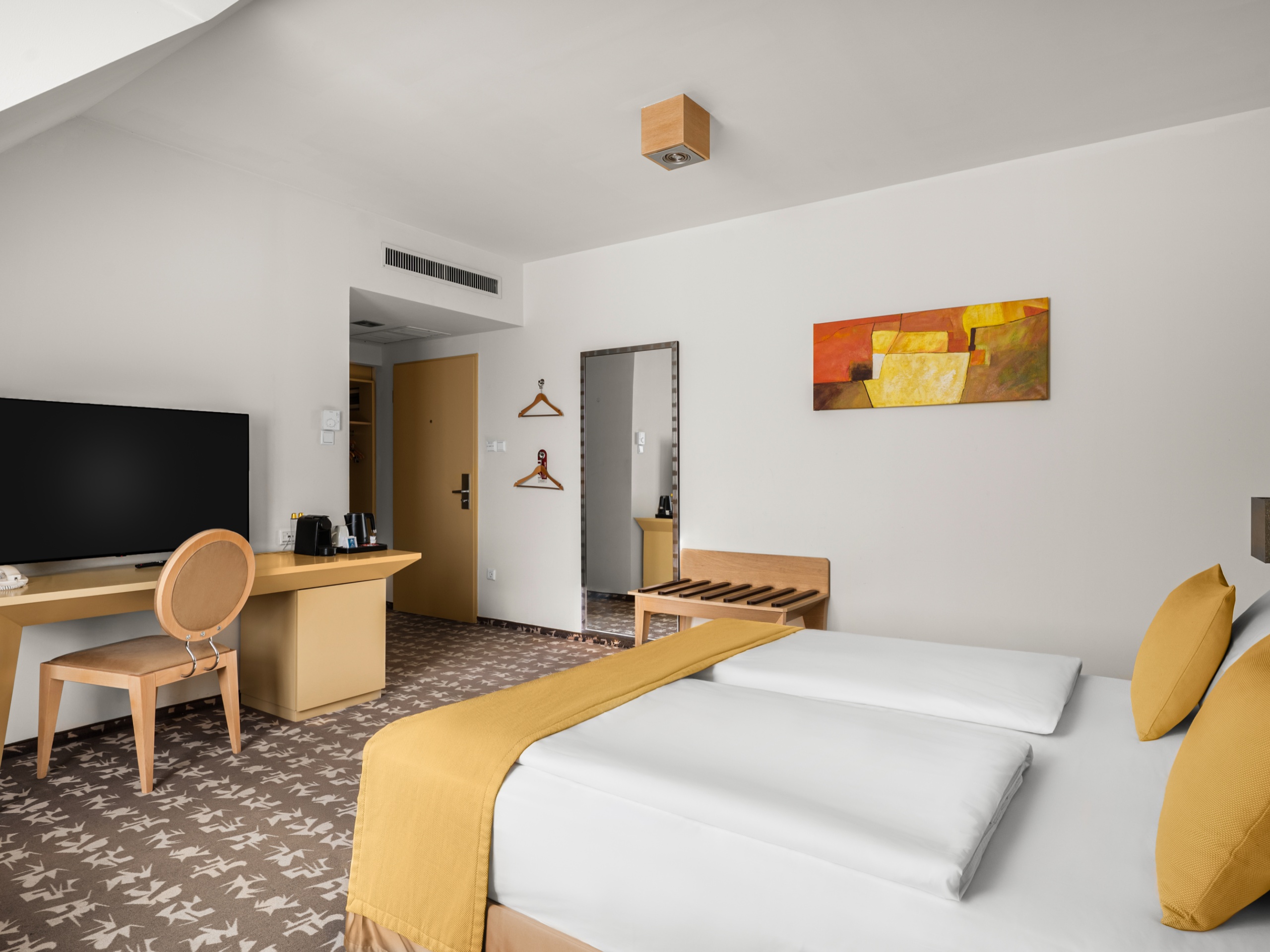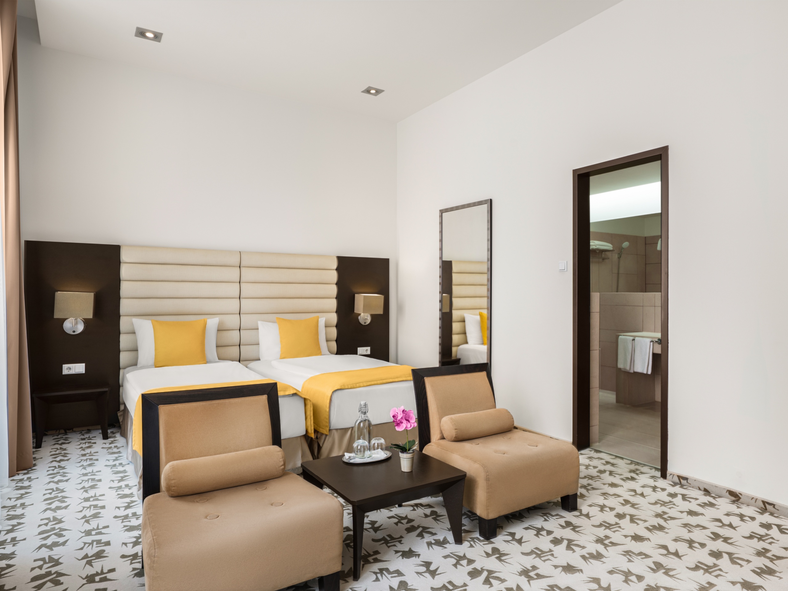 Ein Zimmer in der Größe von 30 m2 mit Platz für ein Doppelbett (180×200 cm) oder zwei Einzelbetten (90×200 cm) und 2 Zustellbetten oder ein Gitterbett. Alle Duplex-Zimmer verfügen über eine Klimaanlage, einen LED-Großbildfernseher, ein geräumiges Badezimmer, eine Minibar, kostenloses W-LAN und sind mit Handtüchern und Bettwäsche ausgestattet.