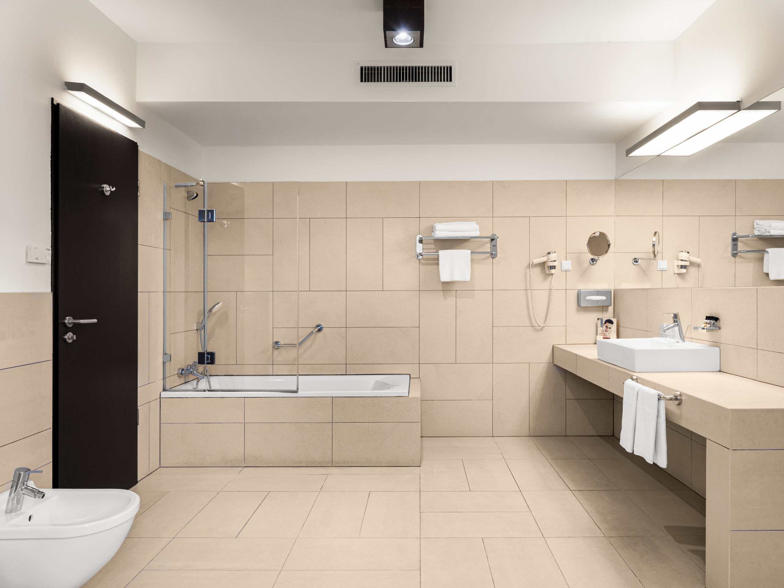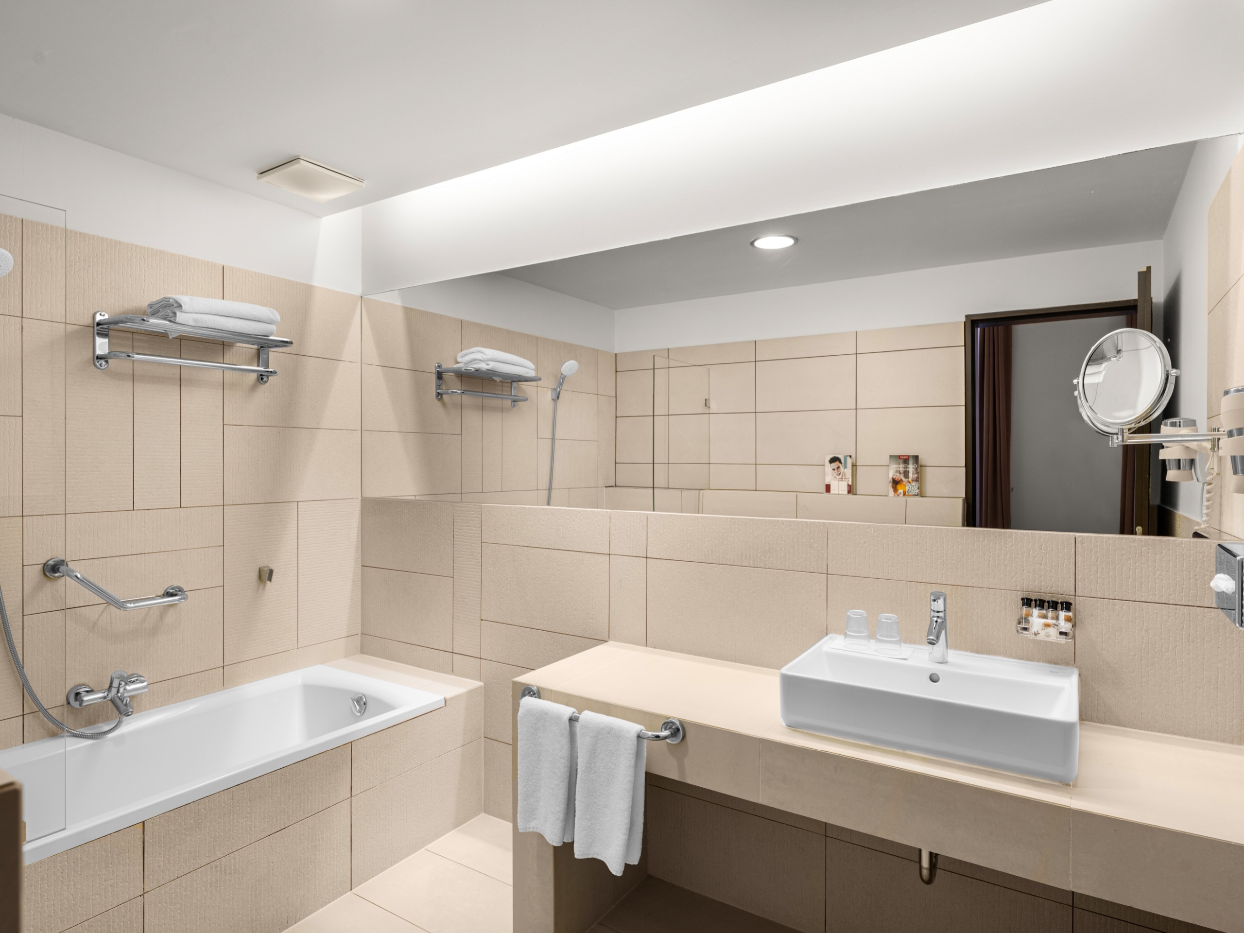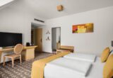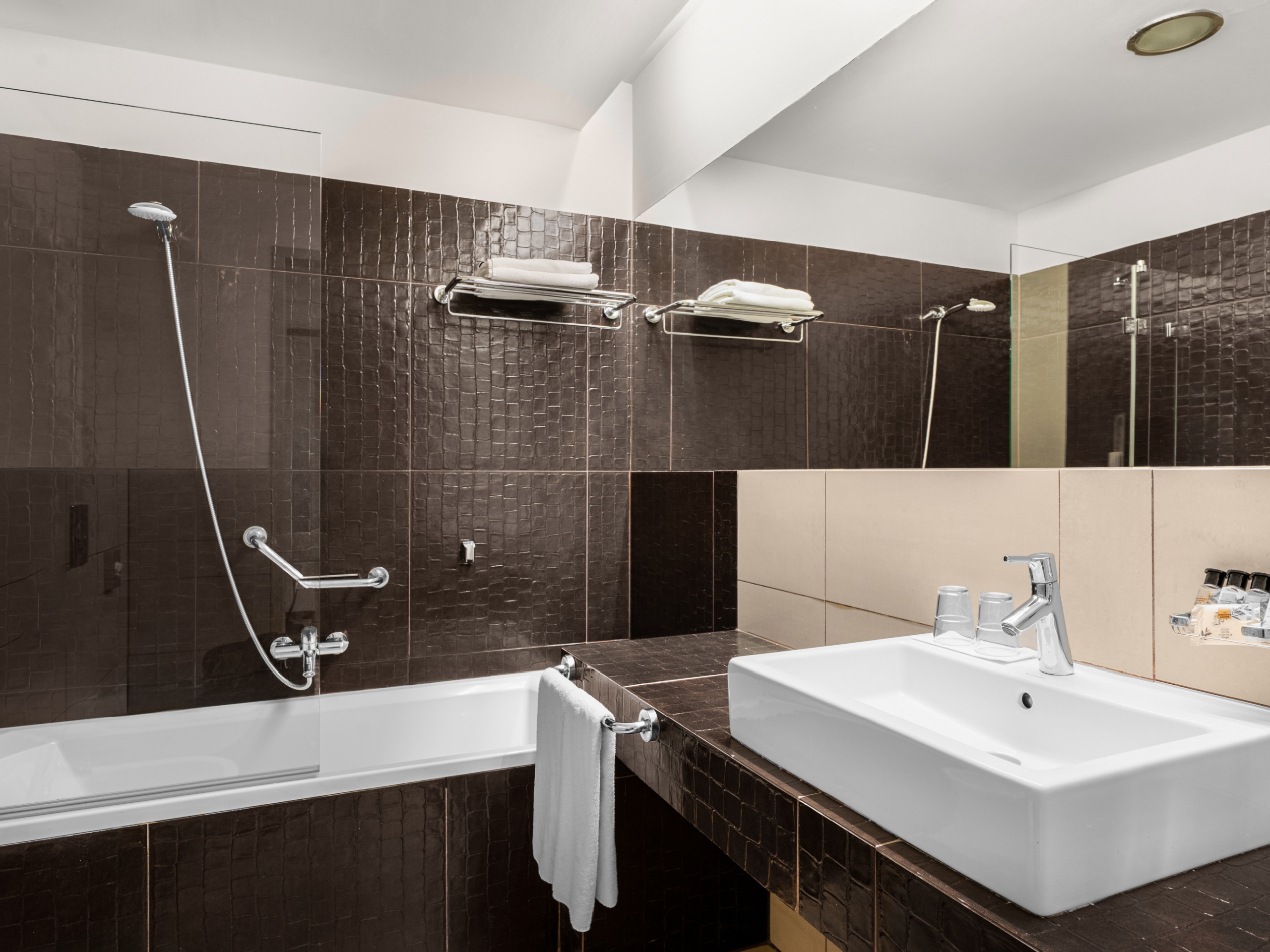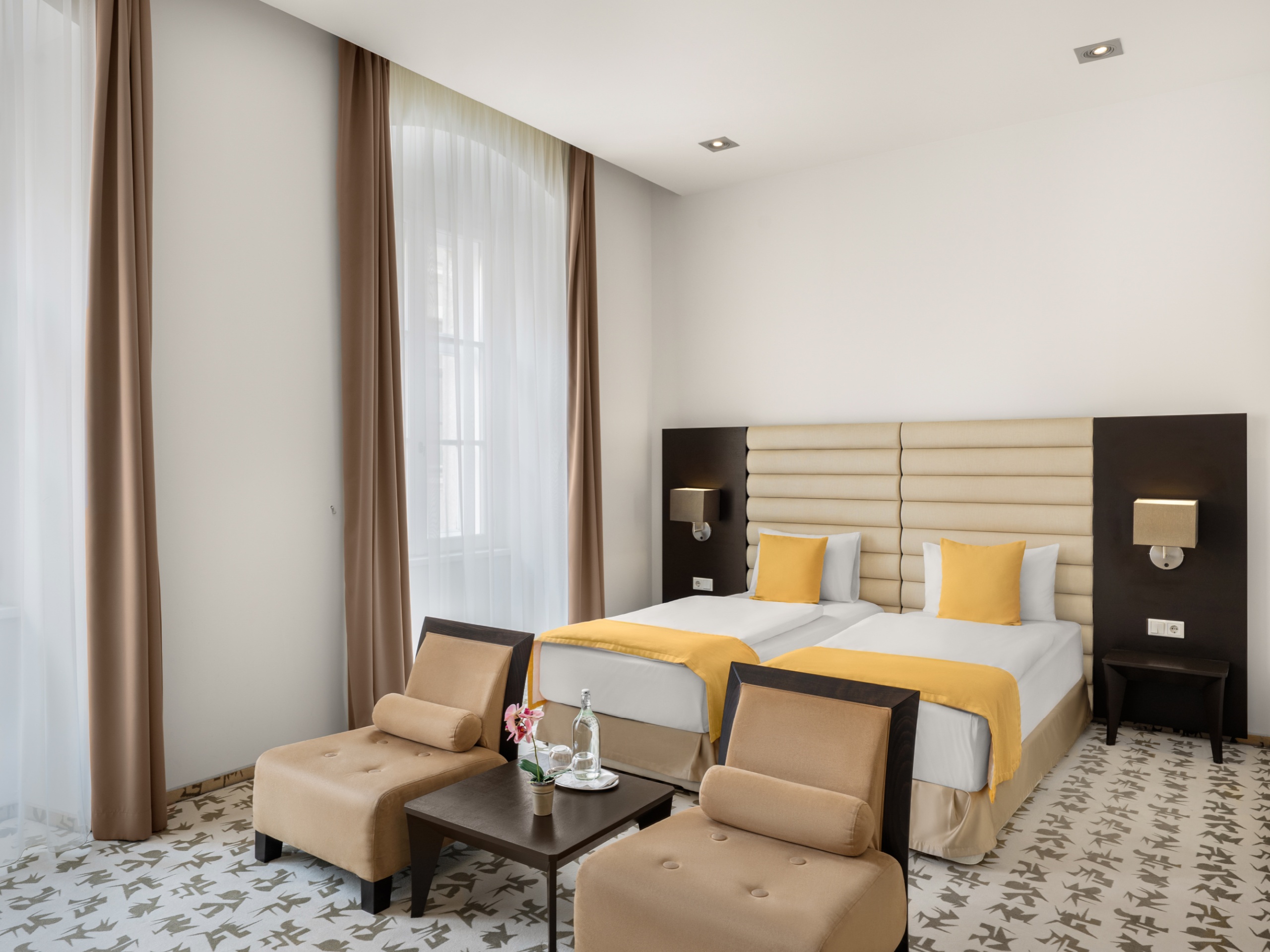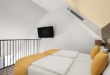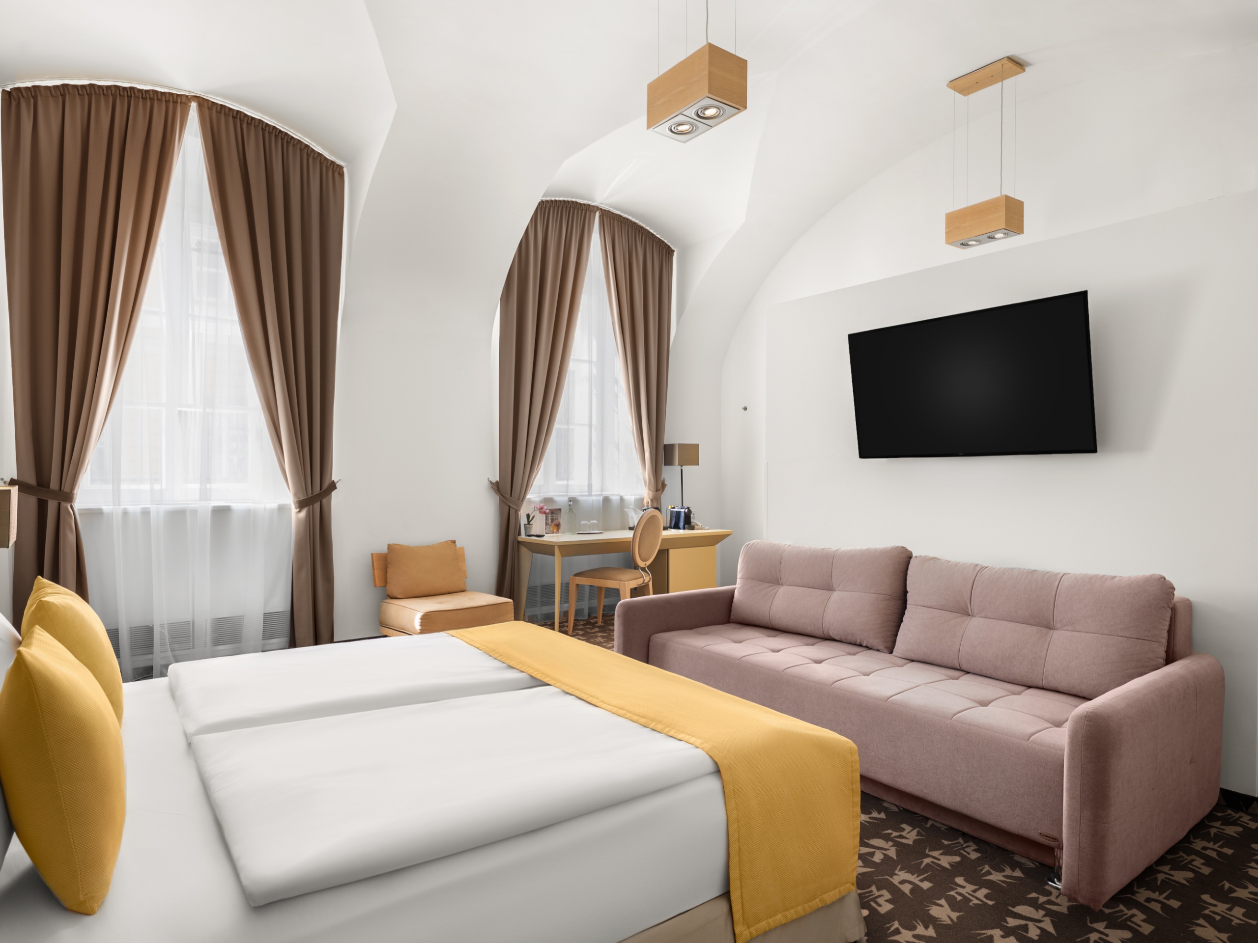 Ein Zimmer in der Größe von 30 m2 mit Platz für ein Doppelbett (180×200 cm) oder zwei Einzelbetten (90×200 cm) und 2 Zustellbetten oder ein Gitterbett. Alle Duplex-Zimmer verfügen über eine Klimaanlage, einen LED-Großbildfernseher, ein geräumiges Badezimmer, eine Minibar, kostenloses W-LAN und sind mit Handtüchern und Bettwäsche ausgestattet.