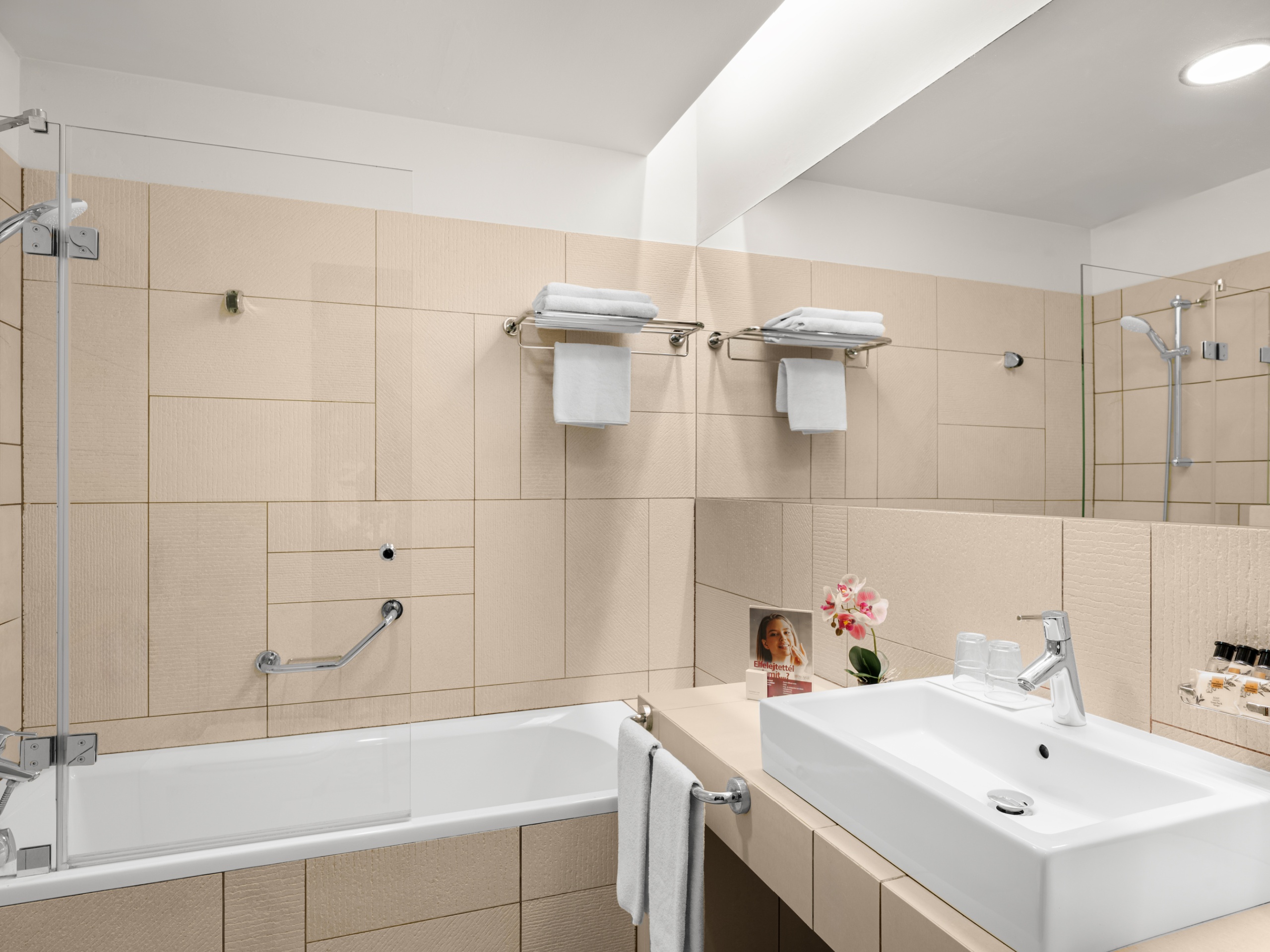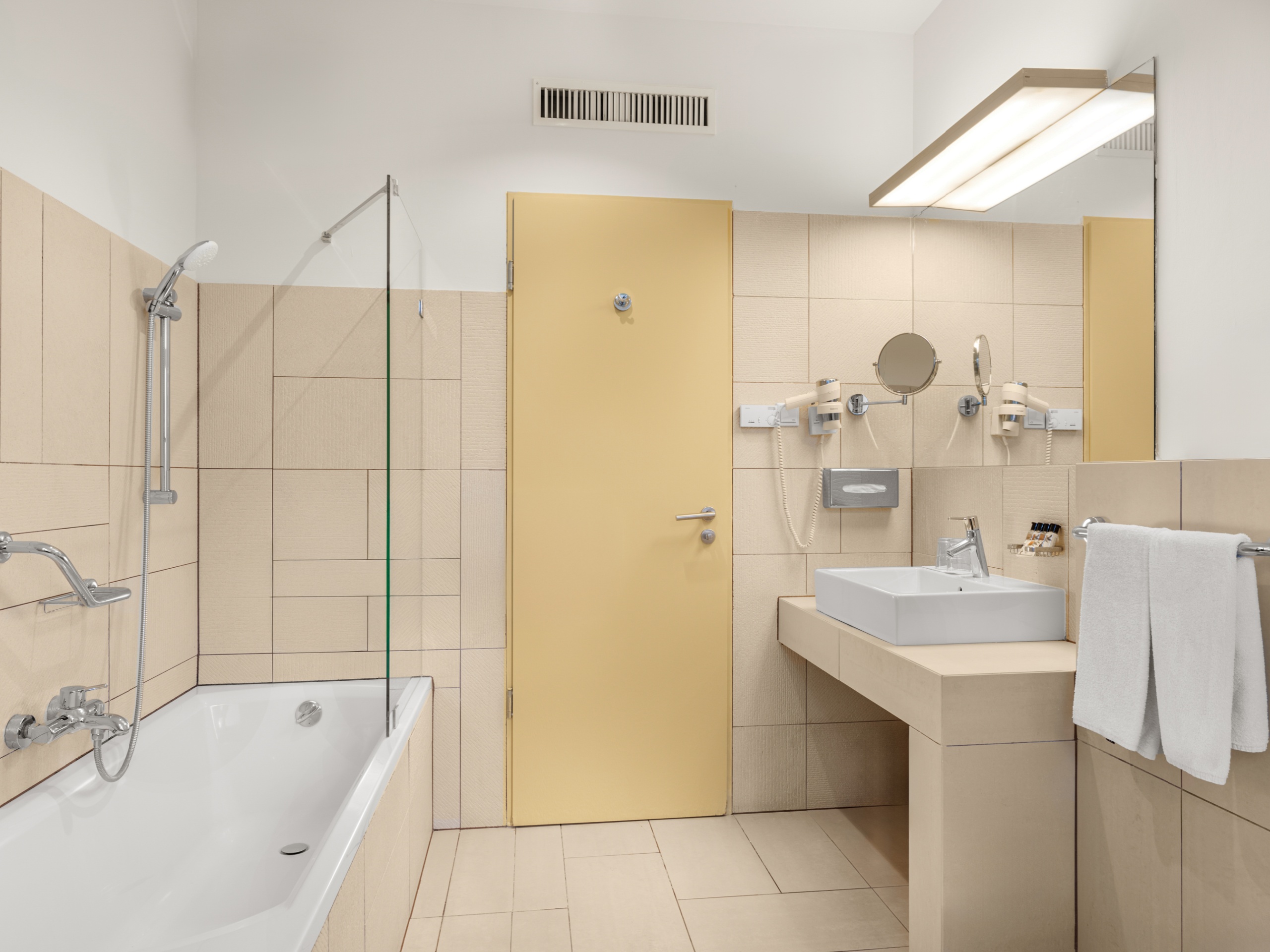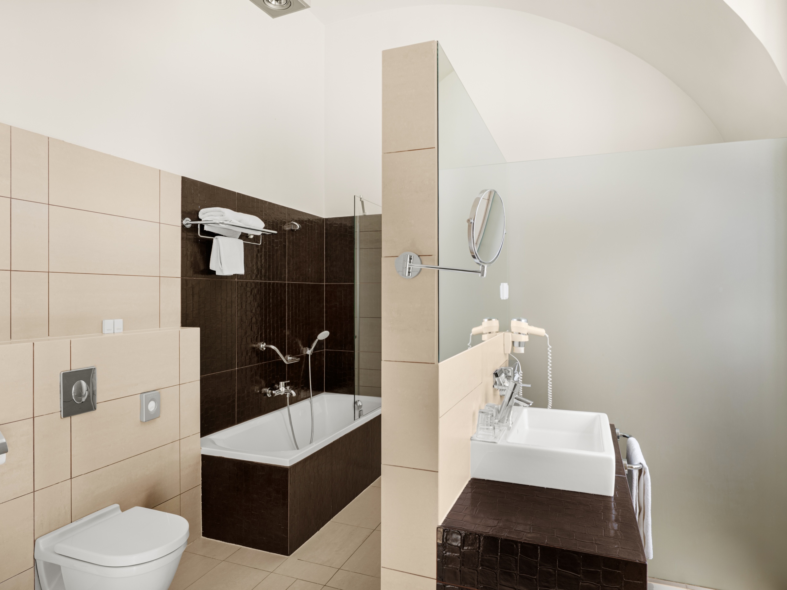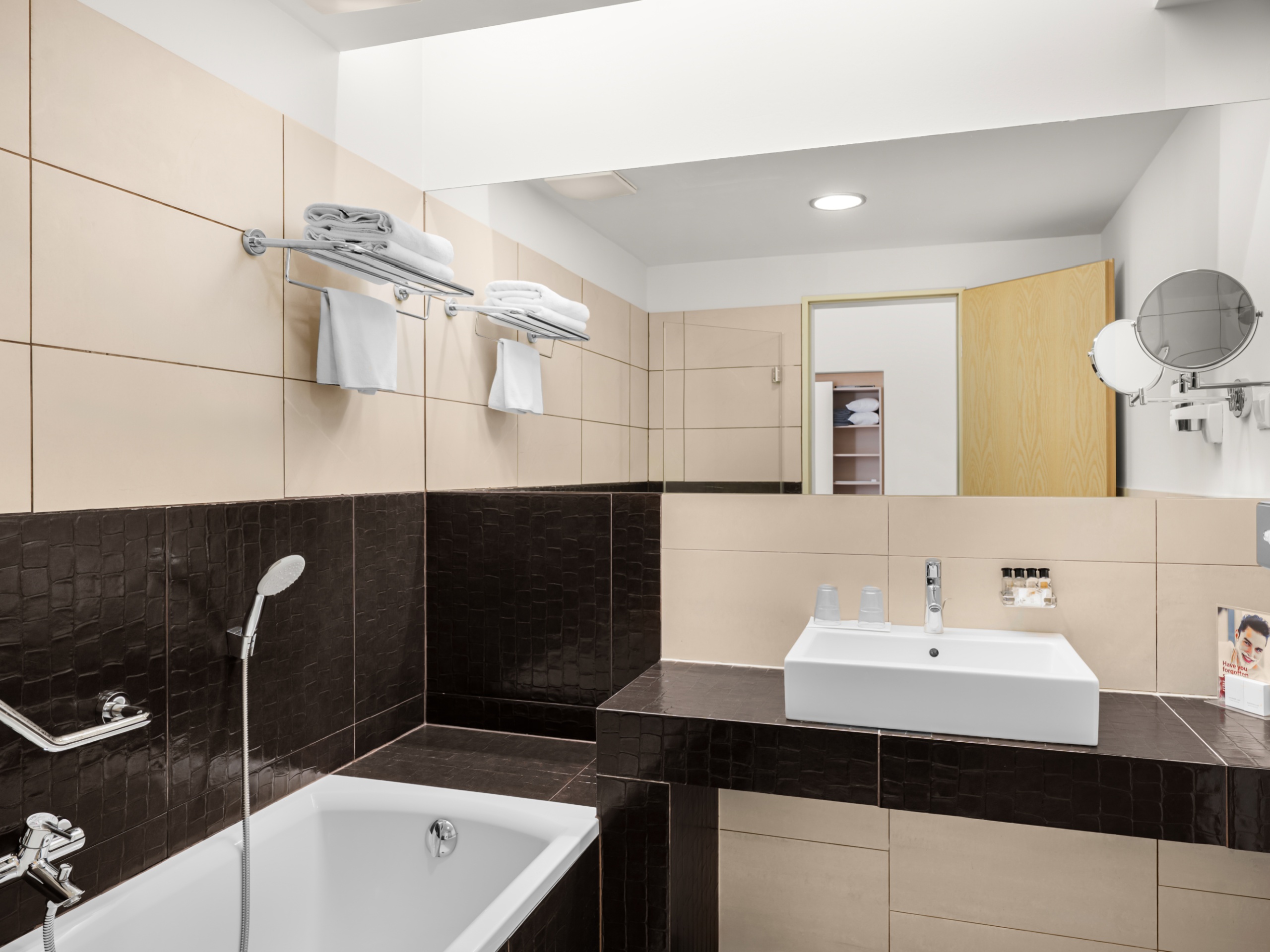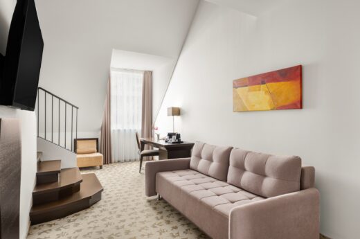 Ein Zimmer in der Größe von 30 m2 mit Platz für ein Doppelbett (180×200 cm) oder zwei Einzelbetten (90×200 cm) und 2 Zustellbetten oder ein Gitterbett. Alle Duplex-Zimmer verfügen über eine Klimaanlage, einen LED-Großbildfernseher, ein geräumiges Badezimmer, eine Minibar, kostenloses W-LAN und sind mit Handtüchern und Bettwäsche ausgestattet.