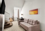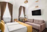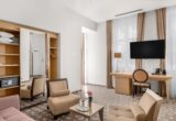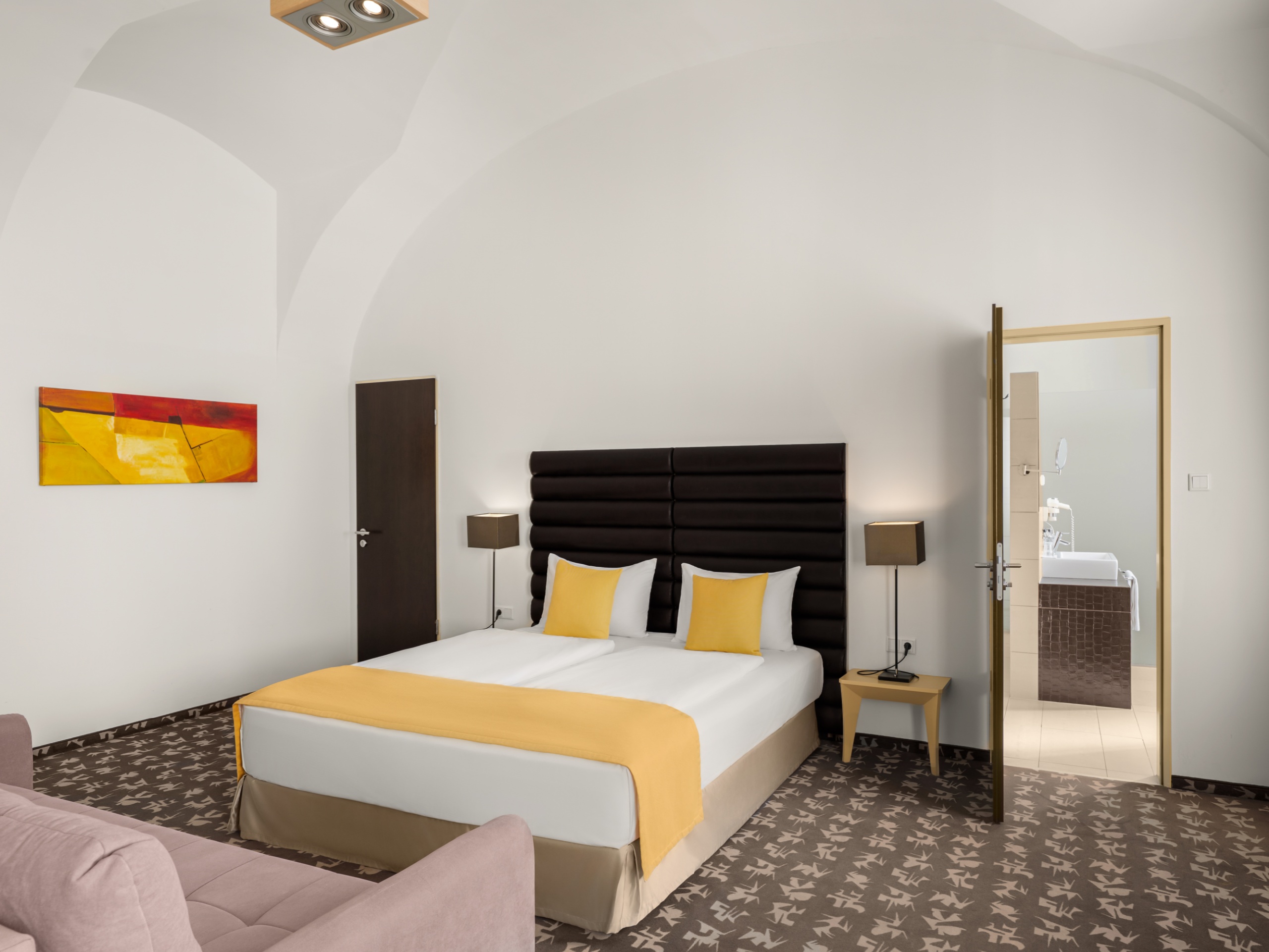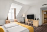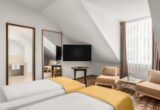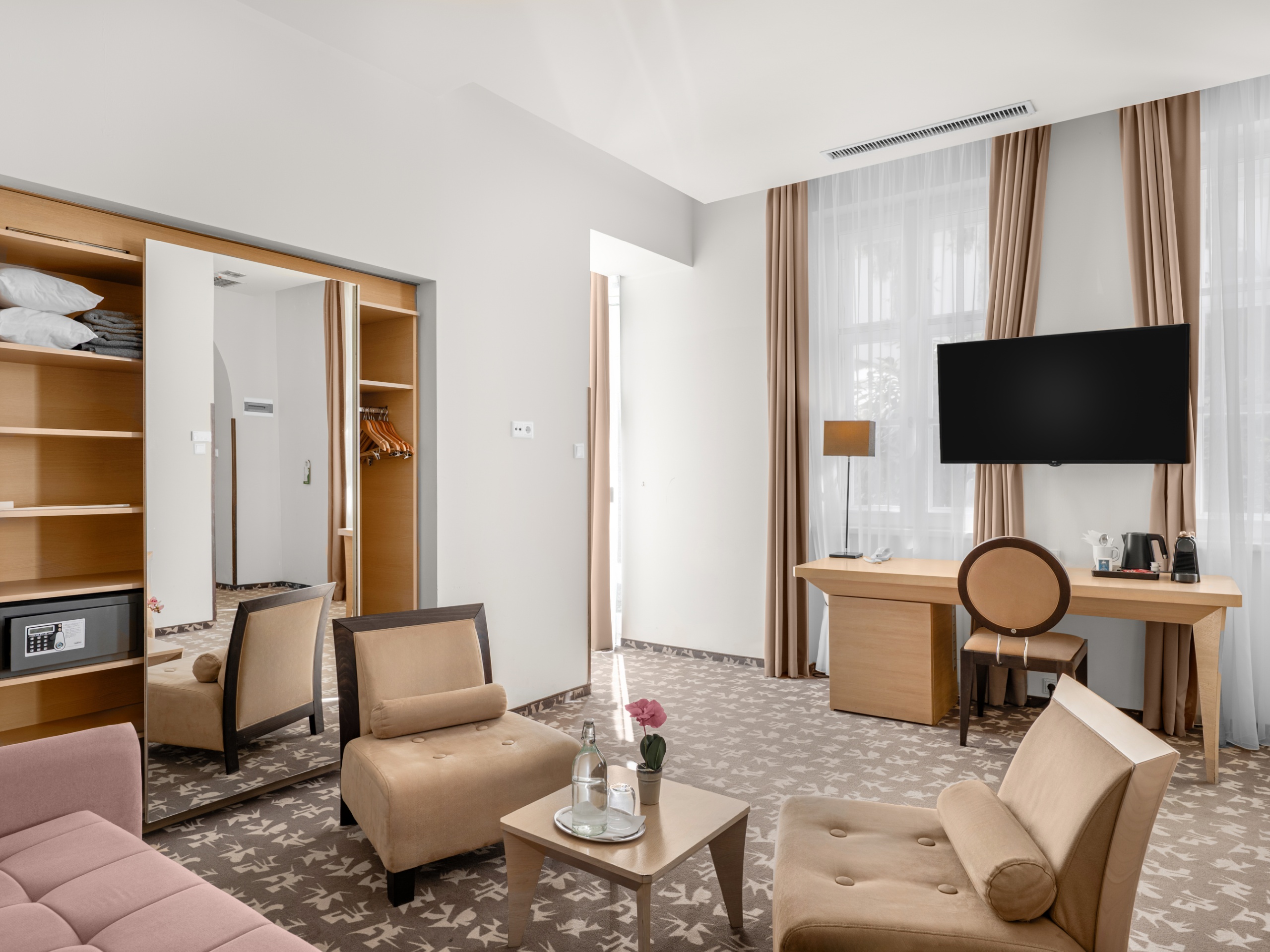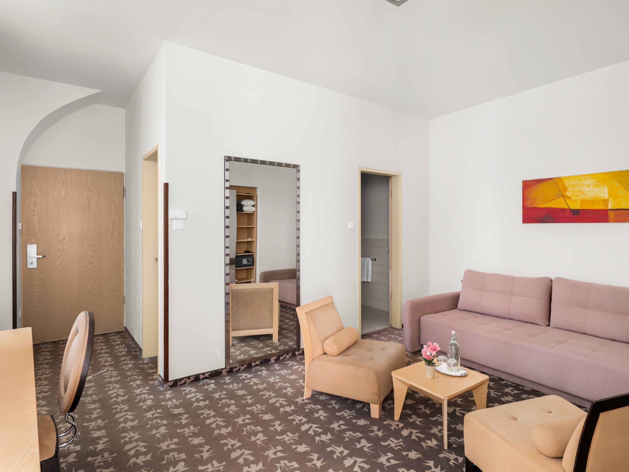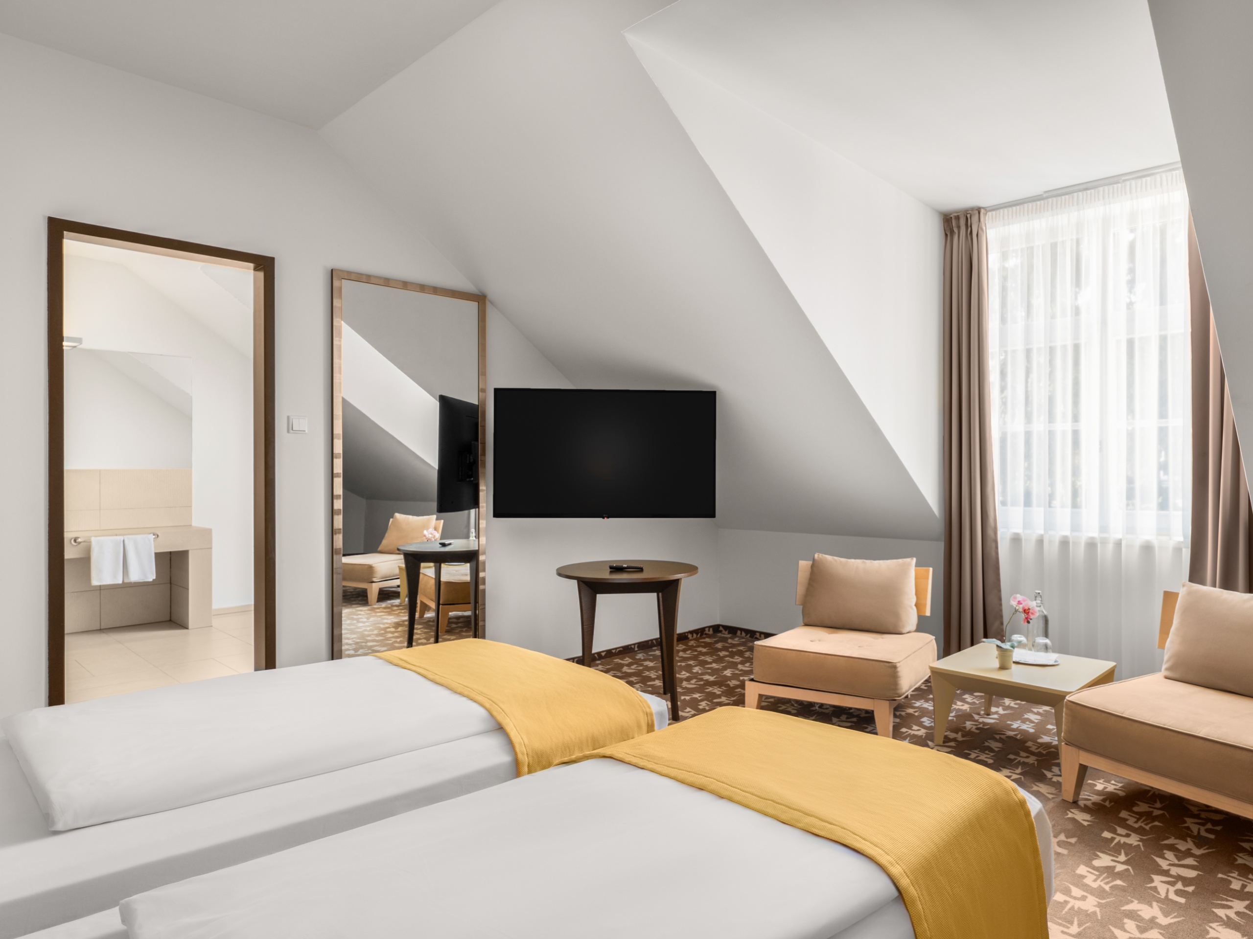 Qualität, Luxus und Komfort in einer 50 m2 großen Suite mit Doppelbett (180×200 cm) oder zwei Einzelbetten (90×200 cm) und Platz für ein Kinderbett. Eine geräumige Suite mit einem separaten Wohnzimmer und einem besonderen Einrichtungsstil. Die Suite bietet alle Annehmlichkeiten – überzeugen Sie sich selbst.